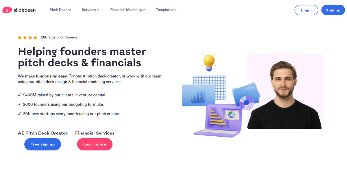 Slidebean is startup-native in a way that most presentation services are not. The company is VC-backed, has worked with thousands of founders, and claims $500M+ raised by clients through their pitch deck design and advisory service. The team includes business analysts and storytellers, not just designers — which matters when you're trying to communicate traction to investors who have seen every format of pitch deck imaginable.