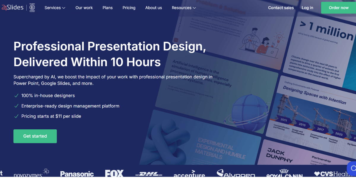 If you have an existing deck that just needs to look polished fast: 24Slides gives you fast turnaround at a transparent price. It's execution-only, but that's often what you actually need.