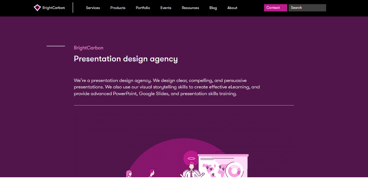 BrightCarbon occupies a specific niche: technically complex presentations where data visualization, animation, and instructional design matter more than a clean template. The agency is UK-based and works heavily in eLearning, financial services, and healthcare — sectors where clarity of communication carries real business risk if it's done poorly.